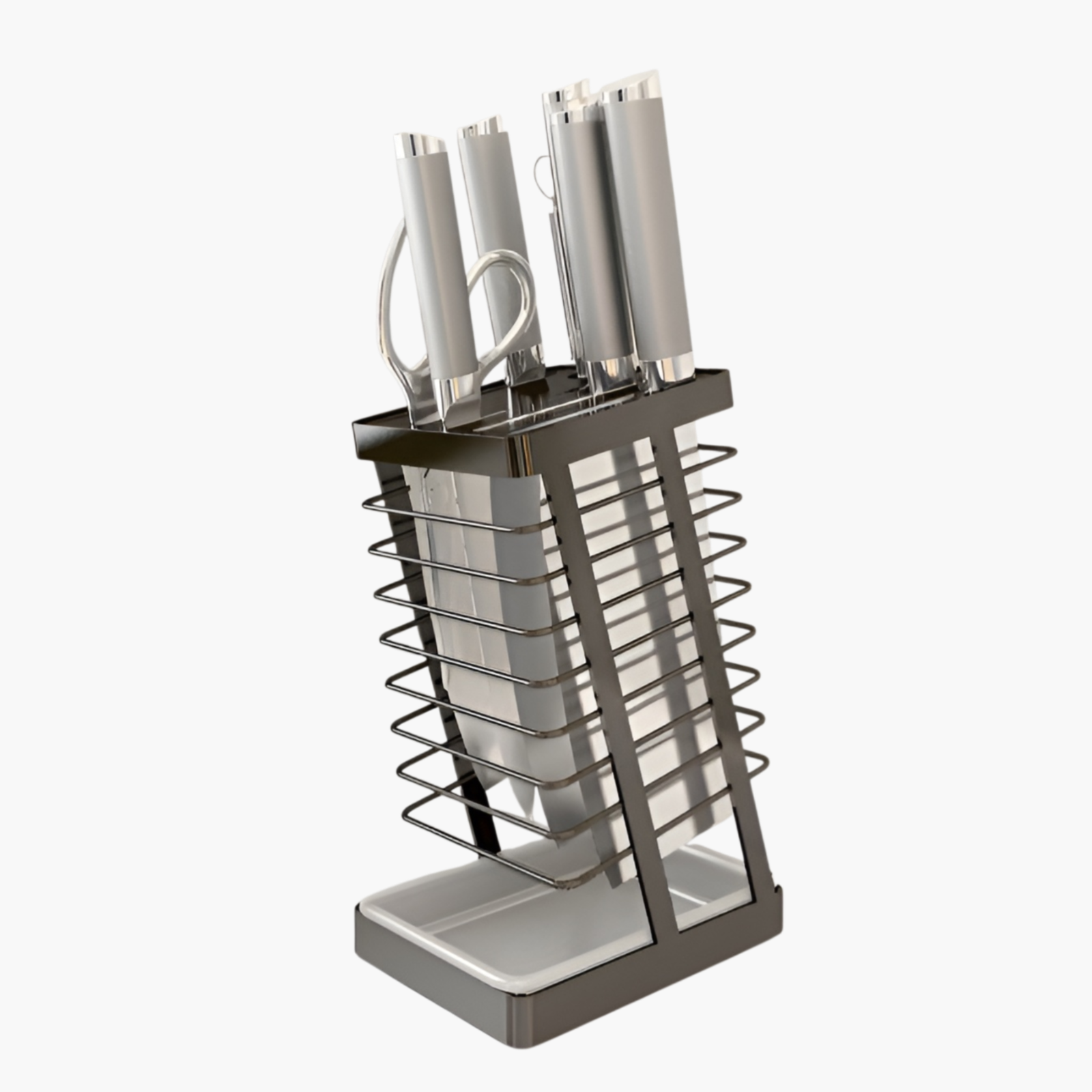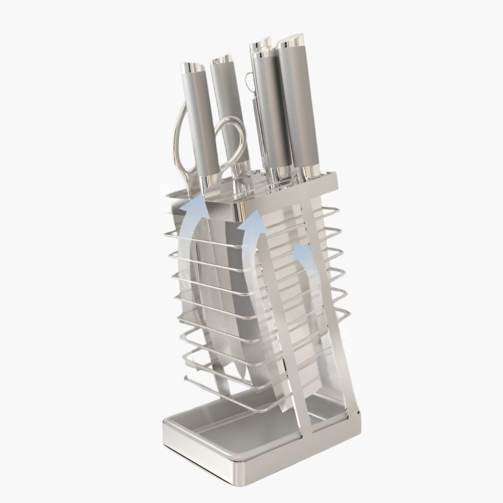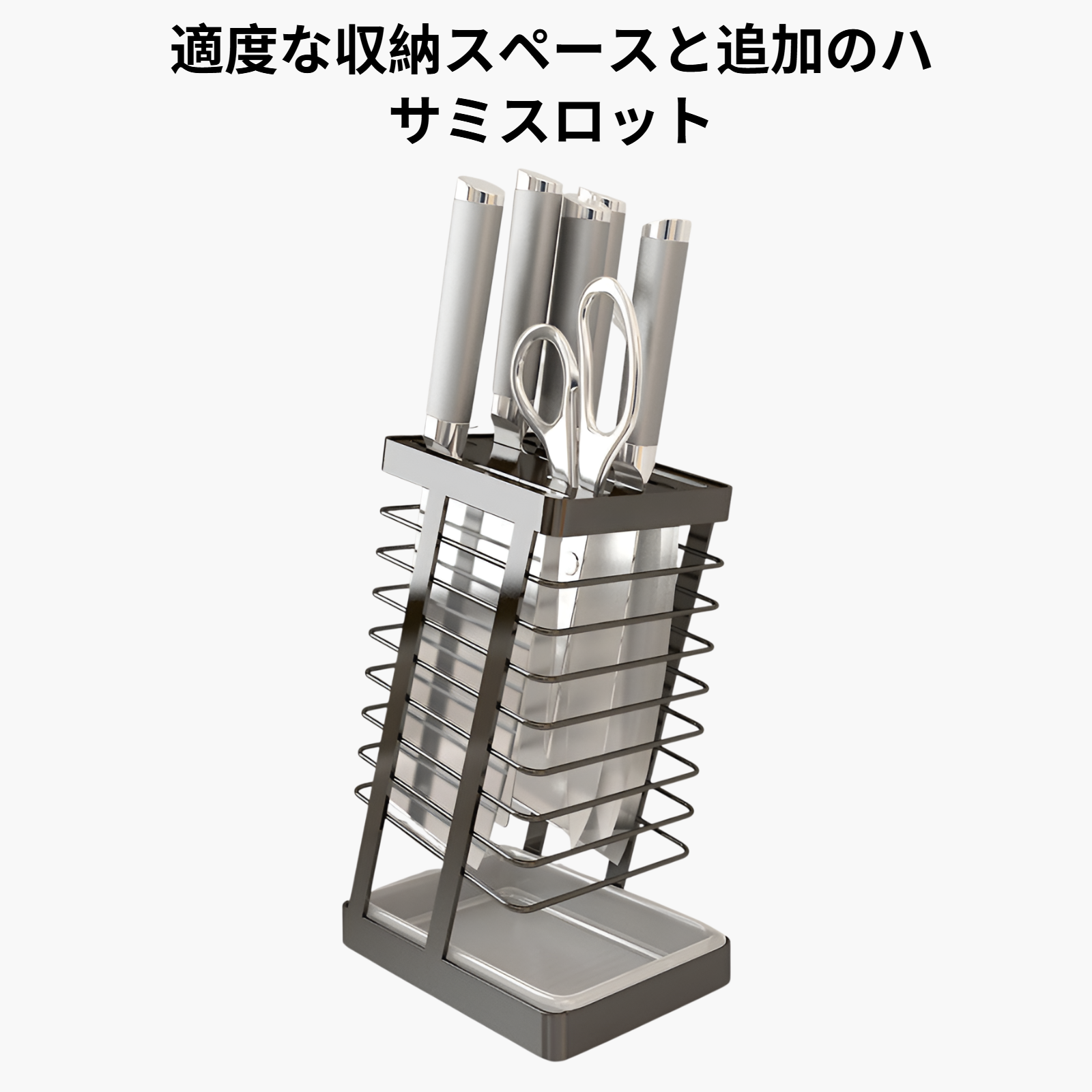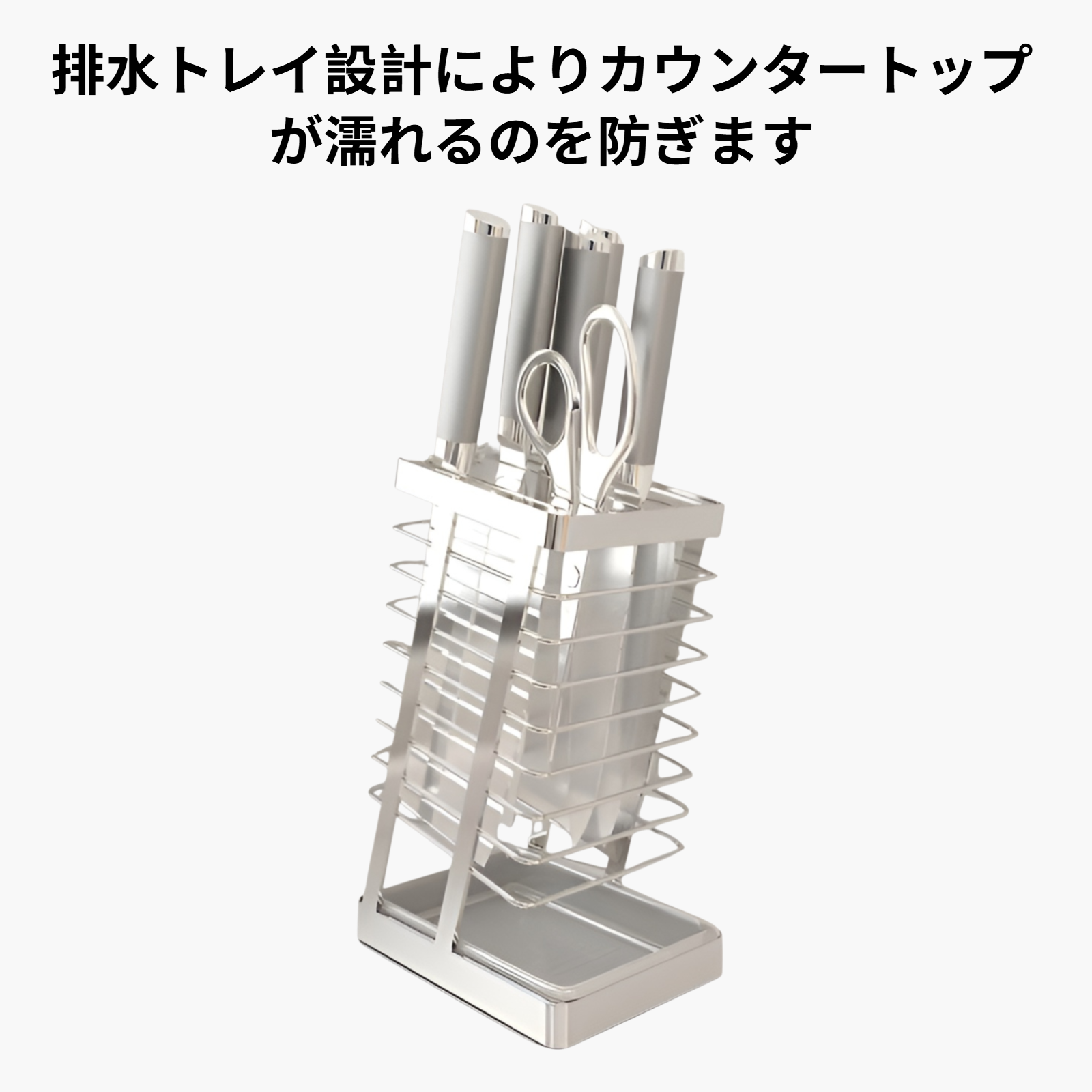 省スペース設計でキッチンを整理。耐久性素材使用、取り付け簡単、複数ナイフ収納対応。清潔で安全な収納を実現。