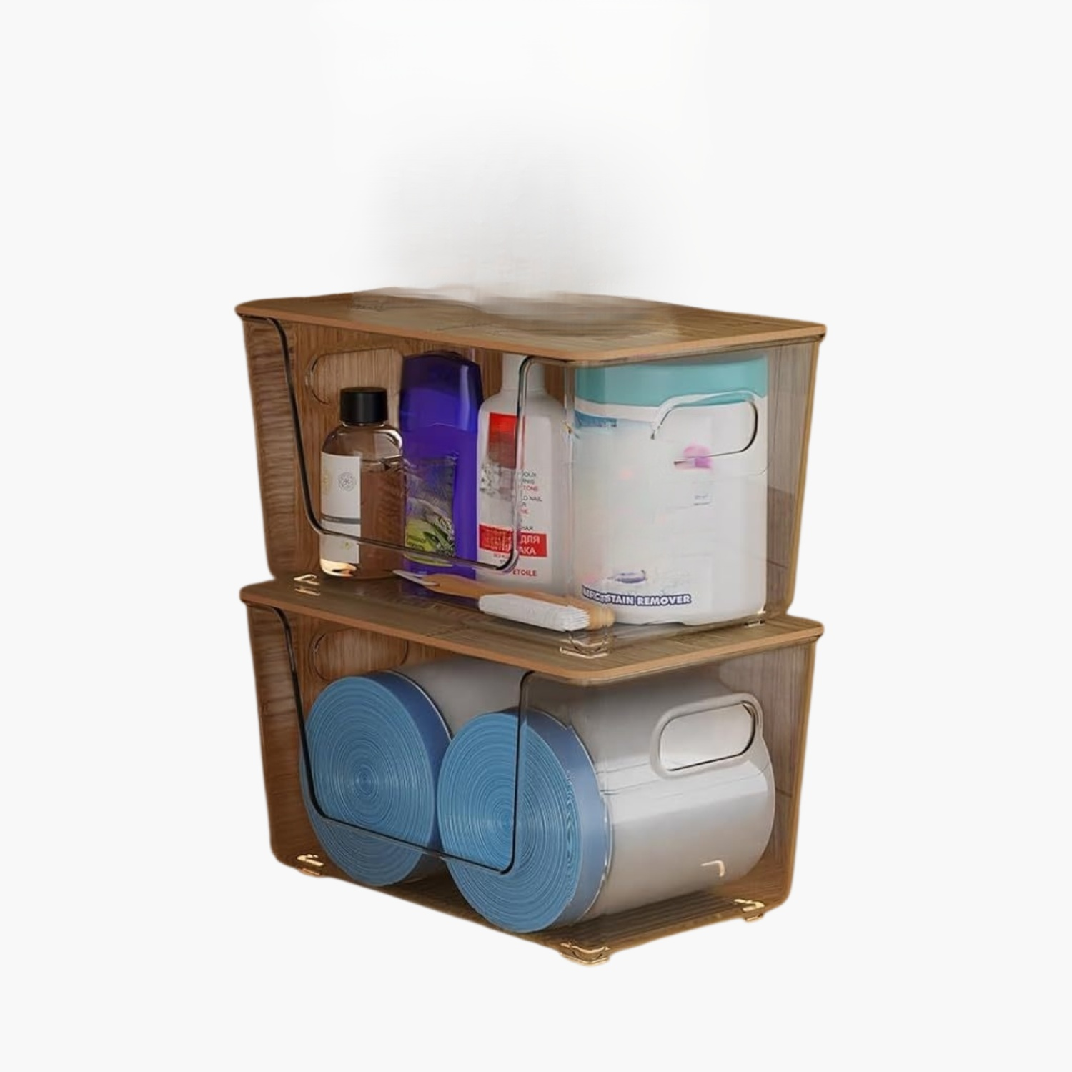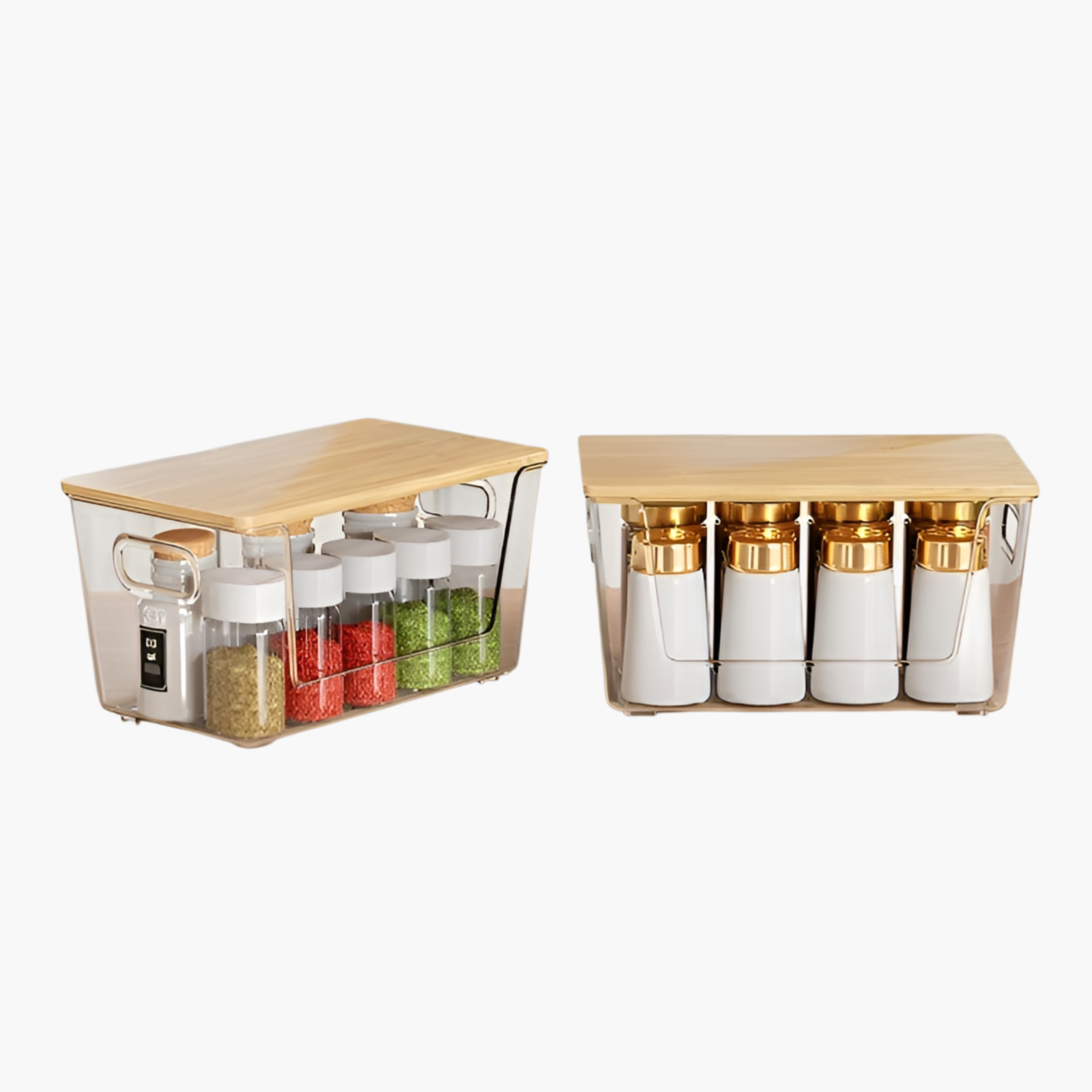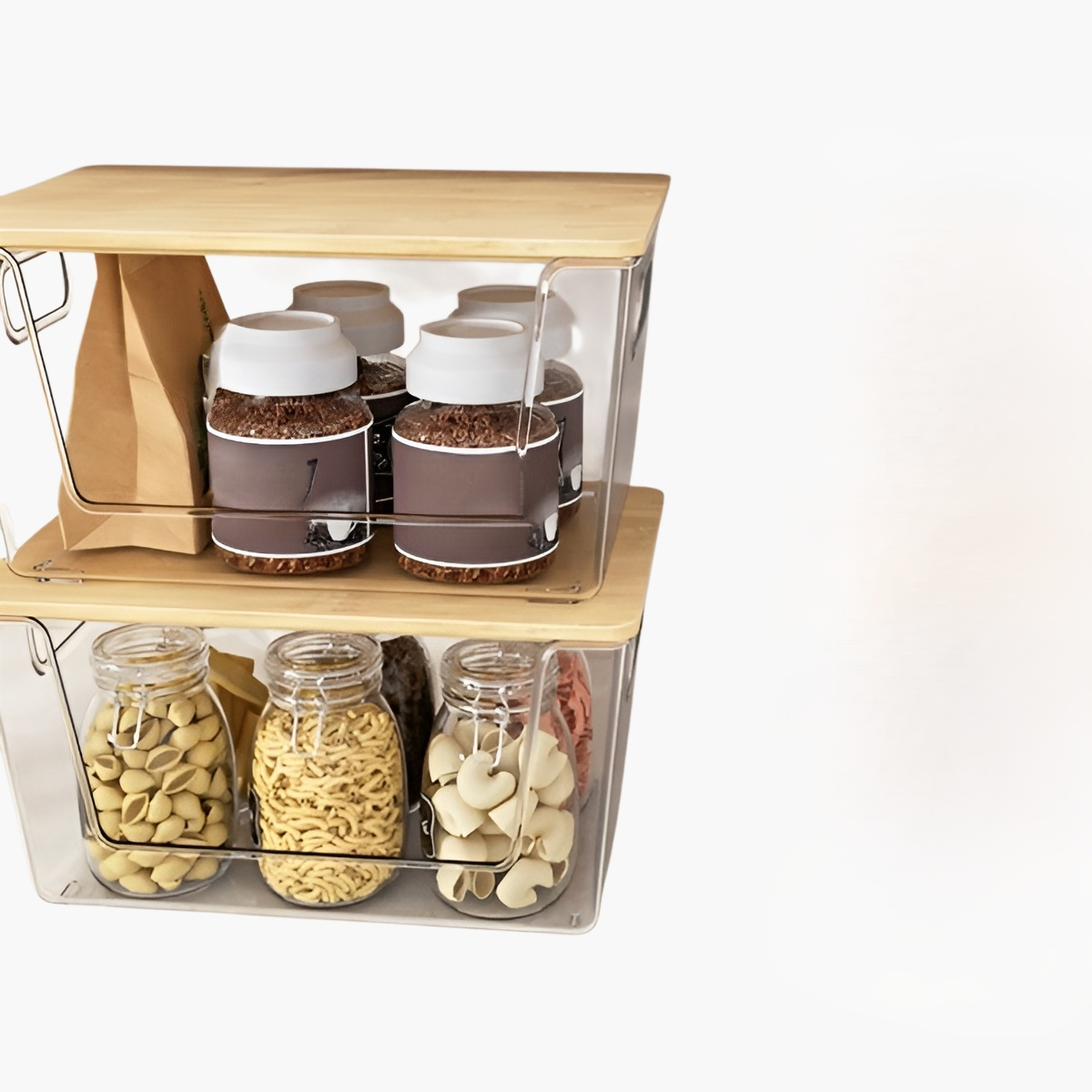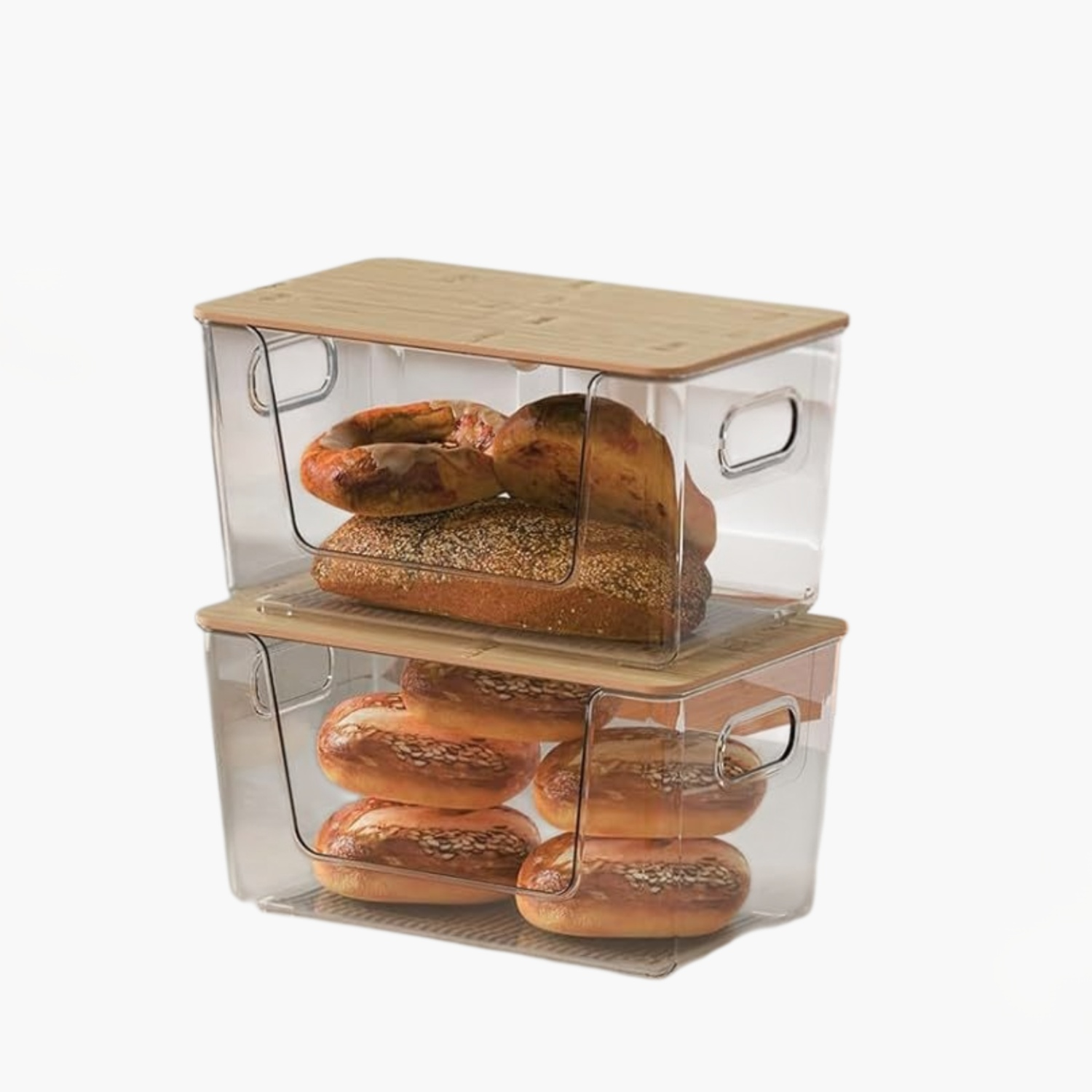 竹蓋付き大容量PET収納ボックスは、透明で中身が見やすく、積み重ね可能。竹蓋でホコリを防ぎ、キッチンやリビングの整理に最適。